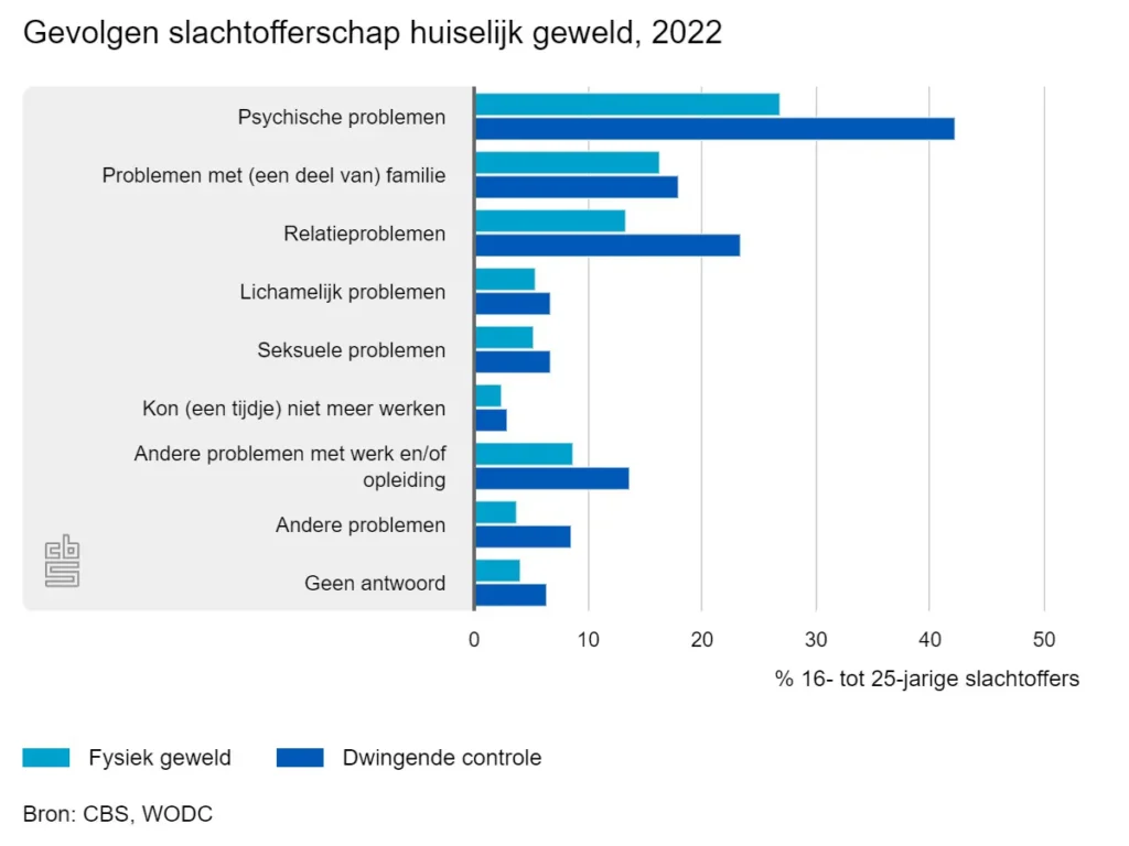 Ruim een kwart van de jonge slachtoffers van fysiek geweld in huiselijke kring gaf in 2022 aan psychische problemen te hebben ervaren als gevolg van wat hen overkomen is. Nog groter was de impact op de jonge slachtoffers van dwingende controle: ruim 40 procent van hen zei psychische problemen te hebben gehad door het voorval. Beide vormen van huiselijk geweld leidden ook relatief vaak tot problemen met (een deel van) de familie of tot relatieproblemen. Ongeveer 5 procent zei lichamelijke of seksuele problemen te hebben gehad.Bron: CBS, WODCPsychische problemenProblemen met (een deel van) familieRelatieproblemenLichamelijk problemenSeksuele problemenKon (een tijdje) niet meer werkenAndere problemen met werk en/ofopleidingAndere problemen