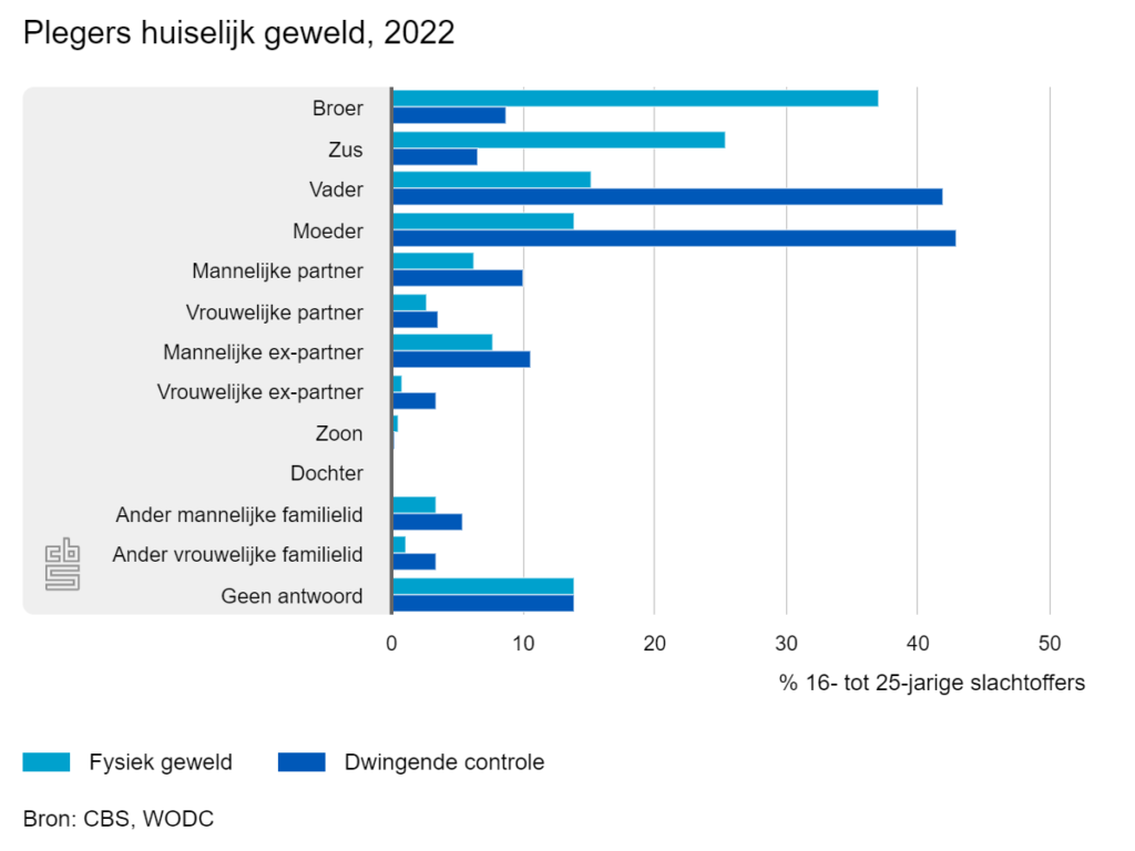 Bij zowel fysiek geweld als dwingende controle in huiselijke kring was de pleger vaak een gezinslid. Bij fysiek geweld ging het vooral om een broer of zus, terwijl dat bij dwingende controle vooral de ouders waren.Bron: CBS, WODCBroerZusVaderMoederMannelijke partnerVrouwelijke partnerMannelijke ex-partnerVrouwelijke ex-partnerZoonDochterAnder mannelijke familielidAnder vrouwelijke familielid