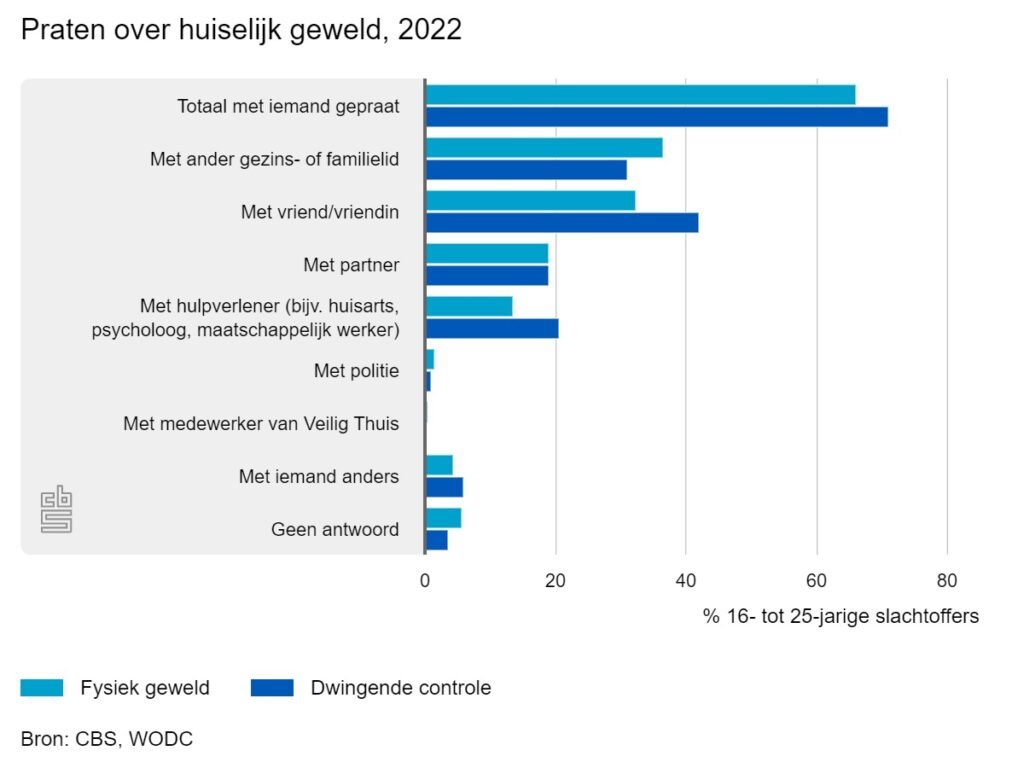 In 2022 zei 18 procent van de jongeren tussen 16 en 25 jaar dat ze in de afgelopen twaalf maanden slachtoffer waren van huiselijk geweld. Dat zijn ruim 350 duizend jongeren. Het gaat niet alleen om fysiek geweld, maar ook om andere vormen van geweld zoals dwingende controle door gezinsleden en stalking door een ex-partner. De meeste slachtoffers praten met iemand over wat hen overkomen is, maar doen dit nauwelijks bij instanties zoals de politie of Veilig Thuis. Dit meldt het CBS.De cijfers zijn afkomstig uit de Prevalentiemonitor huiselijk geweld en seksueel grensoverschrijdend gedrag 2022, een enquête-onderzoek van het CBS en het Wetenschappelijk Onderzoek- en Datacentrum (WODC). Ruim 24 duizend inwoners van Nederland van 16 jaar of ouder namen deel aan het onderzoek, waarvan 2 duizend jongeren tussen 16 en 25 jaar.